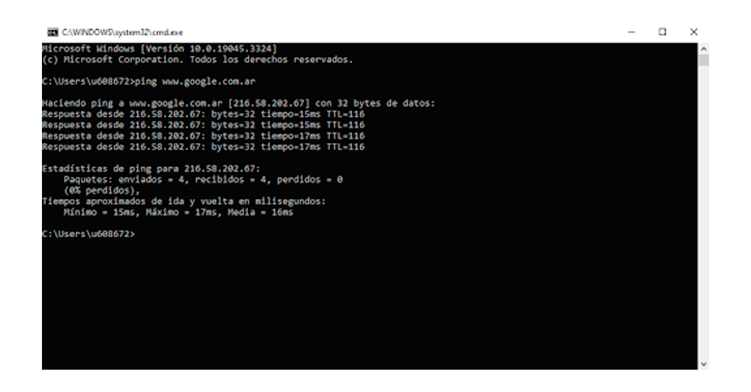 • 3. Luego ingresá en la pantalla negra que se abrió y escribí: PING + URL. Por ejemplo: PING www.google.com, y presioná Enter.