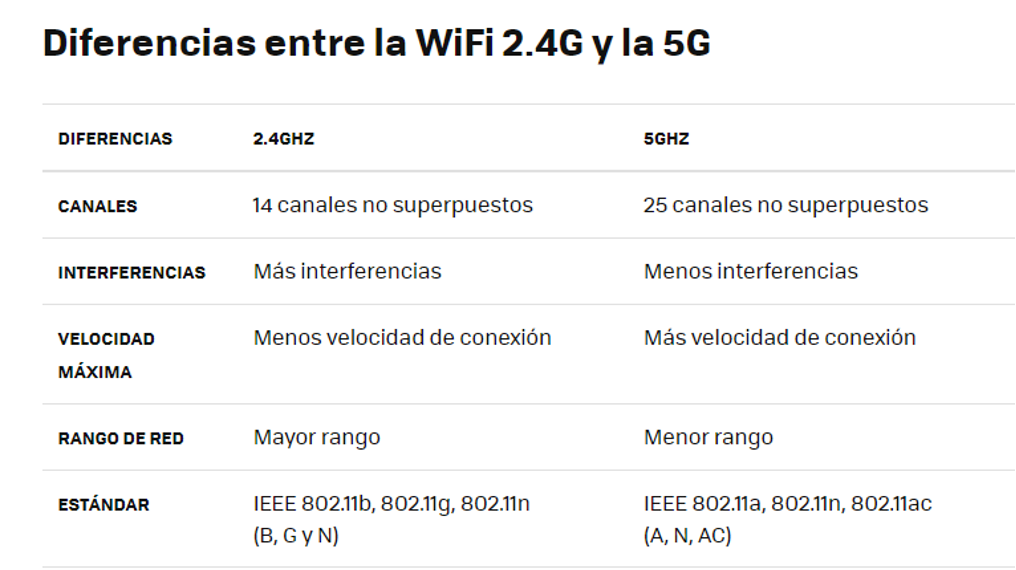 Como ves en la gráfica, las principales diferencias entre ambos tipos de WiFi están en sus canales, el estándar, el rango de red, la velocidad y las interferencias. También es importante que sepas que es posible que algunos de tus dispositivos más antiguos sólo capten la señal de 2.4GHz, ya que es la que más tiempo lleva siendo utilizada, mientras que la 5GHz es relativamente nueva.